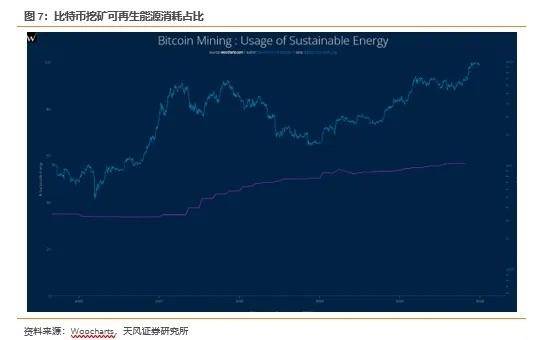 比特币矿工倾向于寻找低成本的电力供应以确保盈利。2023 年,81% 的新投产可再生能源项目(约 382 吉瓦)的成本低于化石燃料项目。以光伏发电为例,2023 年光伏发电的成本在一年内下降到 4 美分 / 千瓦时左右,其成本比化石燃料和核能发电低 56%,因此可再生能源在比特币挖矿领域的使用占比不断提高。根据 Woocharts 数据,截至 24 年 10 月,挖矿使用可持续能源的占比为 56.8%。