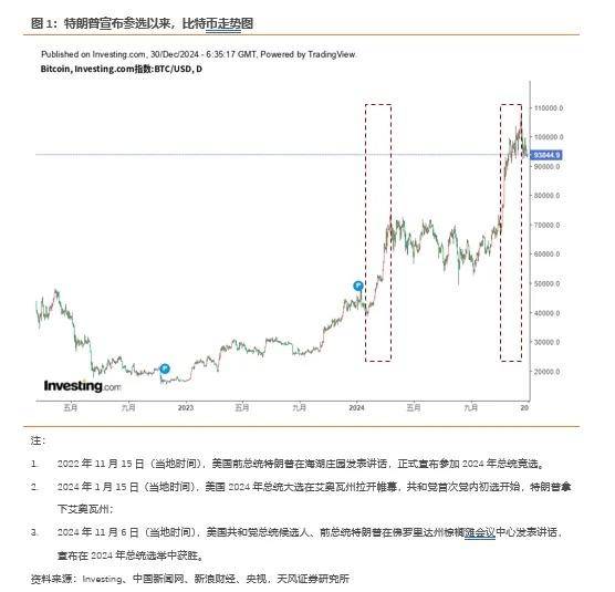 自特朗普宣布竞选总统以来,比特币价格经历了两波显著的增长,涨幅均超过了 40%,分别为艾奥瓦州首战告捷从大约 4 万美元飙升至约 7 万美元,以及赢得总统选举从大约 7 万美元进一步攀升至约 10 万美元。