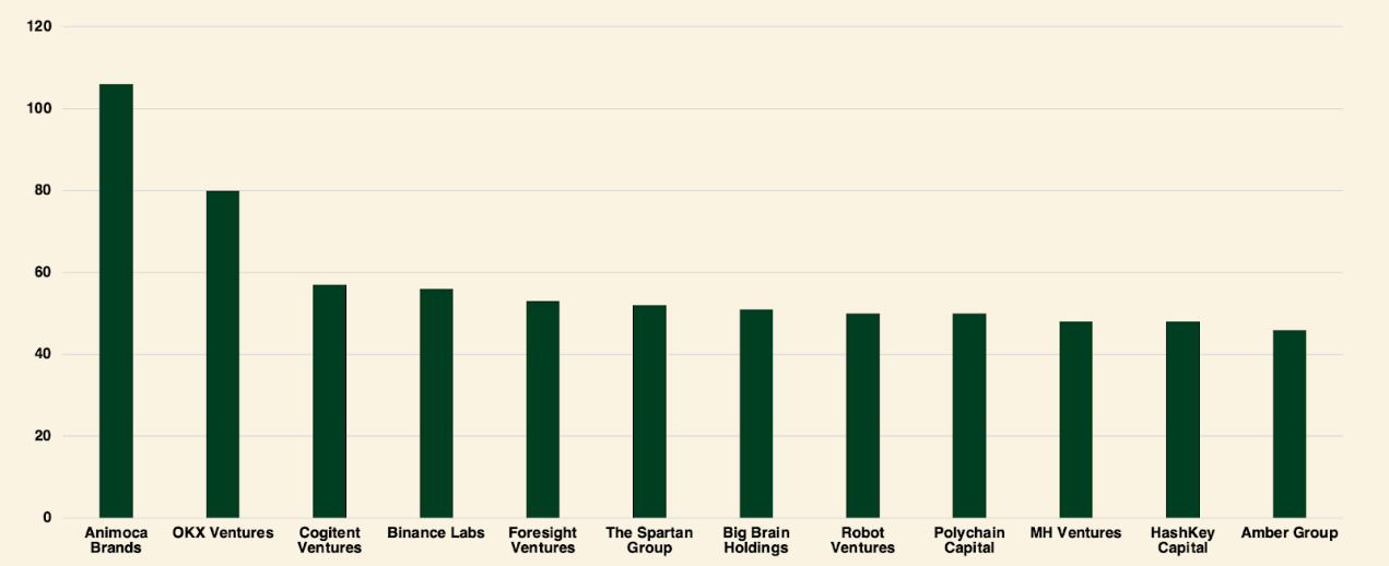 2024年,Animoca Brands 以超过 100 笔投资引领风险投资活动;其次是 OKX Ventures,投资超过 80 笔;Cogigent Ventures、Binance Labs 和 Foresight Ventures 分别完成了约 60 笔投资;而 The Spartan Group、Big Brain Holdings 和 Robot Ventures 完成了 50 多笔投资;Polychain Capita l和 Amber Group等主要参与者保持了 40 多笔投资活动。