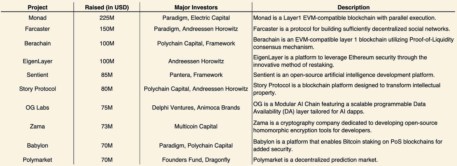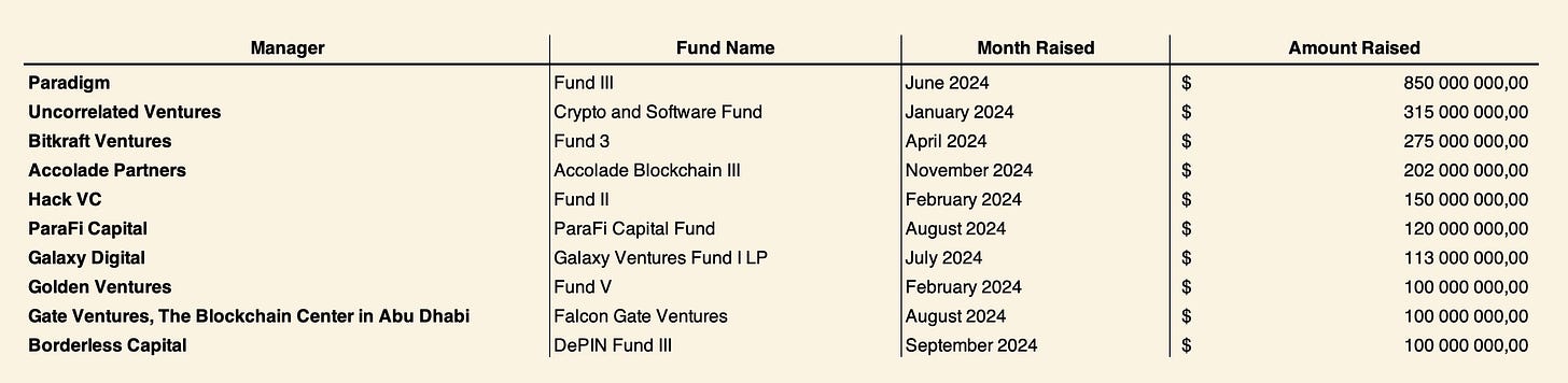 下表总结了 2024 年筹集资金超过 1 亿美元的 10 只基金。2024 年最大的封闭式基金是 Paradigm 管理的Fund III 。
