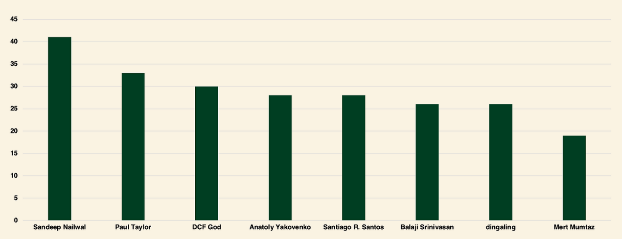 在天使投资人中,最活跃的是 Sandeep Nailwal (Polygon 创始人),参与了超过 40 笔投资;其次是 Paul Taylor 和 DCF God ,各参与了 30 笔以上;Anatoly Yakovenko (Solana 创始人);Santiago R. Santos 和 Balaji Srinivasan 也是重要参与者,完成了超 25 笔投资;Mert Mumtaz 略微落后,但仍然很活跃。
