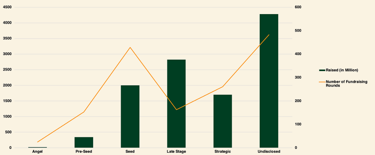 上图表明,除未披露的轮次外,加密行业仍高度集中在早期融资阶段。早期交易吸引了大部分资本投资,占 60%,而后期融资占总资本的 40%,较第三季度的 15% 显著上升。