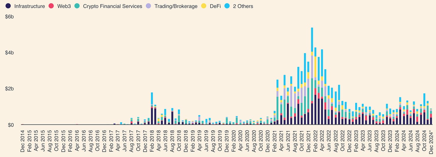 根据 Galaxy Research 数据,风险投资者在 2024 年第四季度向以加密货币和区块链为重点的初创公司投资了 35 亿美元,环比增长 46%。然而,交易数量环比下降 13%,为 416 笔。