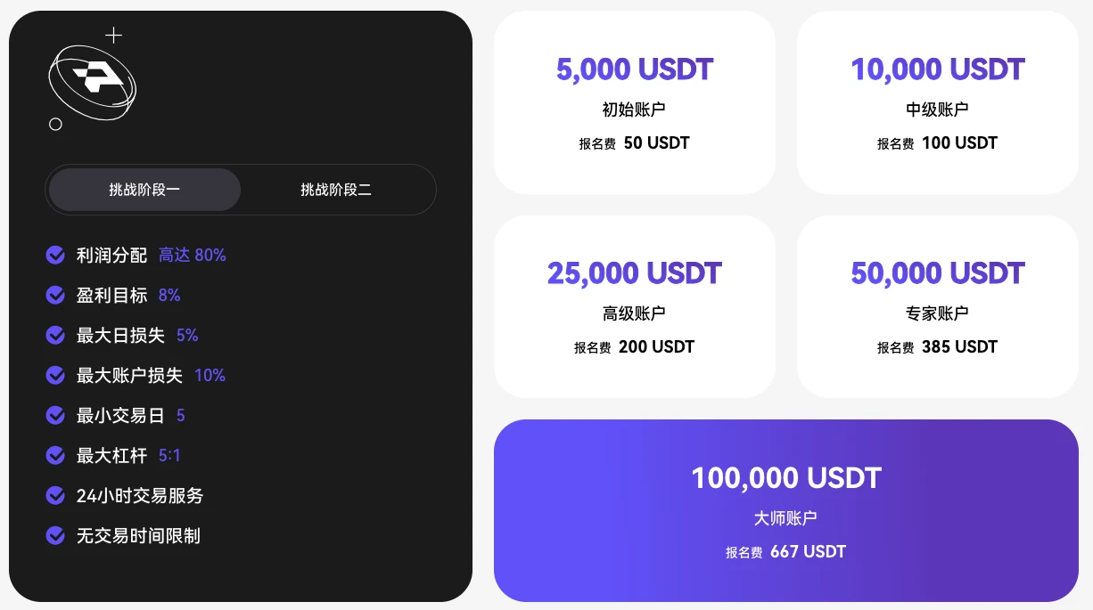 PropW 是 CoinW 在 2024 年 4 月 24 日发布的一款自营交易产品,即用户在缴纳一定报名费,并通过交易测试后便可利用平台自有资金进行交易,金额从 5000 美元到 20 万美元不等,盈利分配高达 80% ,用户达到盈利目标还可获得报名费全额返还。