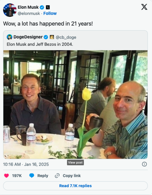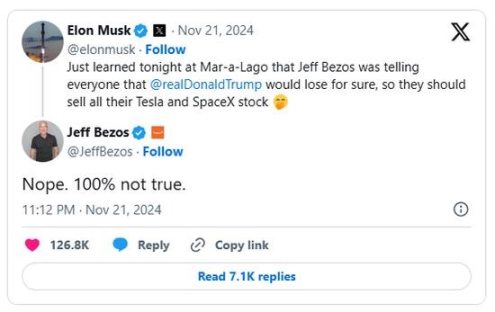 去年 11 月,马斯克曾在 X 上炮轰贝佐斯:「今晚在海湖庄园得知,杰夫·贝佐斯曾到处跟人说@realDonaldTrump 肯定会输,所以他们应该卖掉所有特斯拉和 SpaceX 股票。」