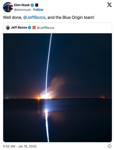 马斯克在 X 平台大方送上祝福:「祝贺 @jeff Bezos 第一次尝试就进入轨道。团队做的很棒!」