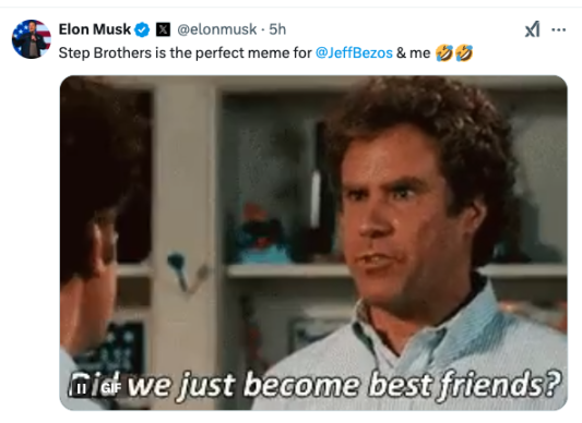「Step Brothers 对我和贝索斯来说是一个完美的表情包」(随附的 GIF 动图中两个主角宣称他们成为「最好的朋友」)。