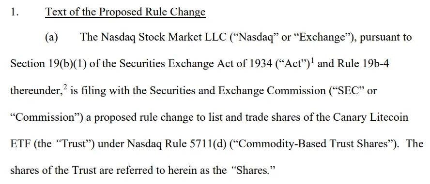 1月17日,纳斯达克为Canary Funds的莱特币ETF申请提交了19b-4表格。文件显示,U.S. Bancorp Fund Services, LLC将担任管理方,U.S. Bank N.A.将负责托管ETF的现金。根据文件,Coinbase Custody Trust Company LLC将托管ETF的莱特币。