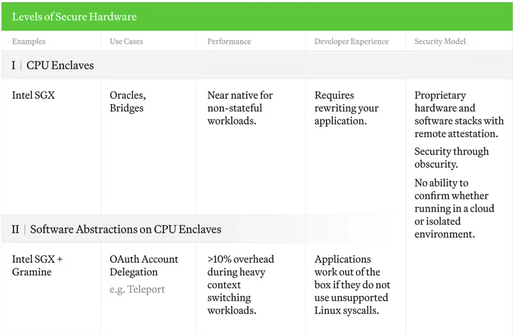 Phala 经历多轮牛熊,在代币经济模型上,暂时还维持着面向英特尔 SGX 的商业模式。从 Paradigm「The 5 Levels of Secure Hardware」一文可知,安全硬件有 5 个级别,其中第二级别是指:性能稍差,但开发者体验更好,允许使用更具表现力的应用程序,安全性无改进。 英特尔 SGX 在这一级别中,是专为 TEE APP 服务的。如本文开头提及的,电脑和手机中指纹的录入比对以及面部识别等敏感的本地存储的数据会使用英特尔 SGX,这种上一代的 TEE 是具体为 APP 服务的。