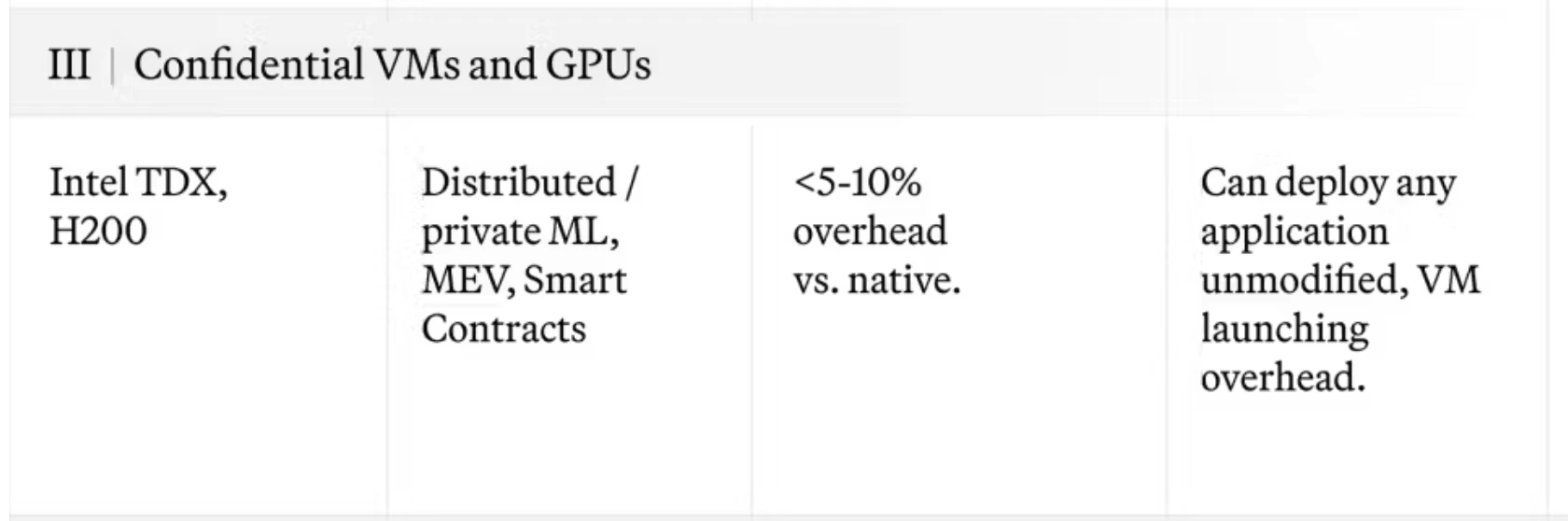 当用例进一步扩大,不仅局限在应用层面,而是上升到系统层面。英特尔 SGX 无法满足市场需求,英特尔 TDX 应运而生。英特尔 TDX 专为虚拟机设计,甚至英伟达的H100和H200也开始支持 TEE,是为 AI 服务的 TEE 硬件。