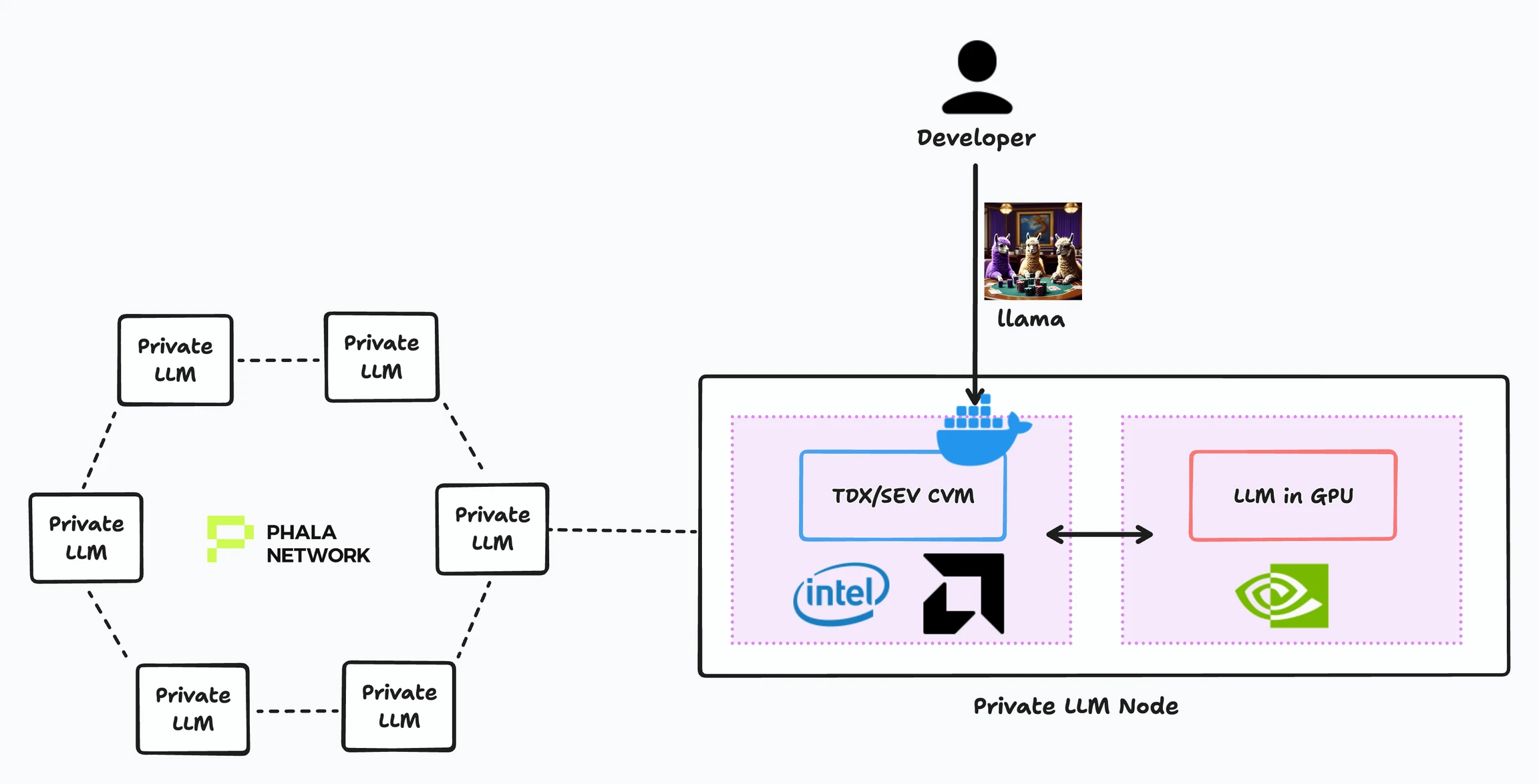 下图展示了 Phala Confidential AI Inference(私有 LLM 节点)服务的架构。要在 TEE 中托管私有 LLM,只需将 LLM 推理代码封装成一个 Docker 镜像,然后将容器部署到 TEE 网络中。