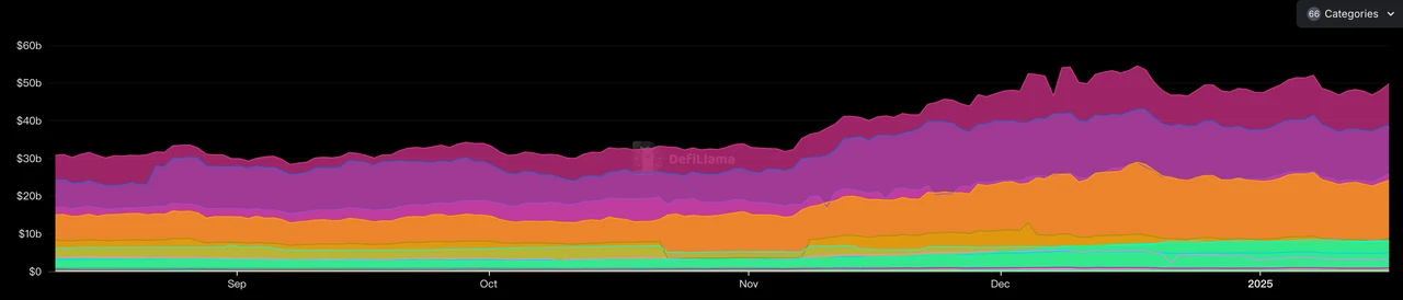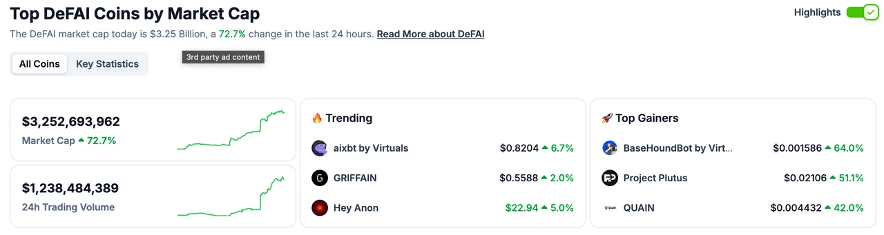 DeFi 板块 TVL 小幅增长至 535 亿美元,环比增长约 1% 。值得注意的是,DeFAI 作为 DeFi 与 AI 的结合产物,市值在一周内从 6 亿美元暴增至 32 亿美元,显示出市场对创新型 DeFi 应用的强烈追捧。