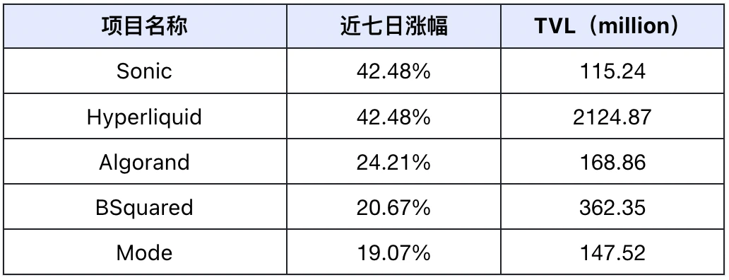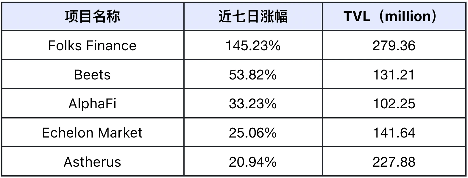 过去一周市场项目 TVL 涨幅前 5 名(未计入 TVL 较小的公项目,标准为 3000 万美元以上),数据来源:Defilama