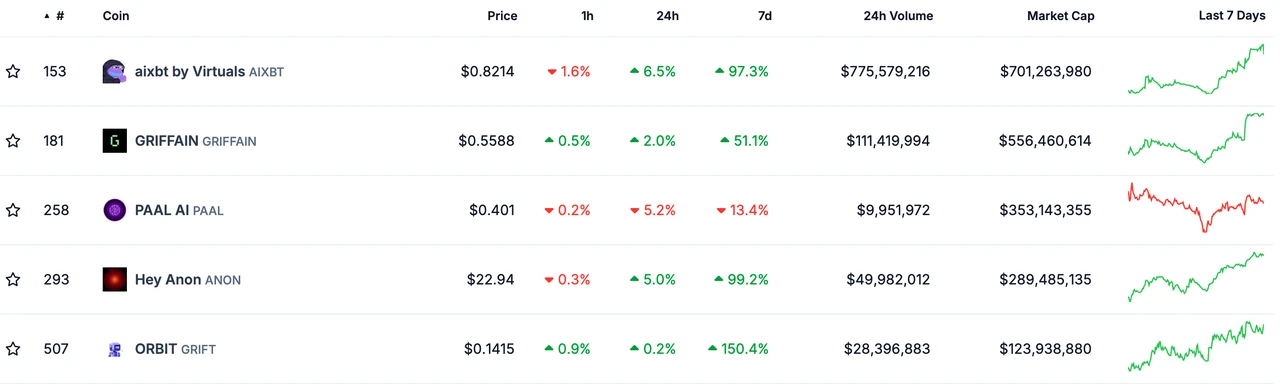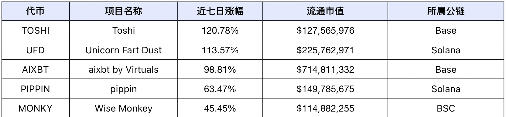 过去一周市场代币涨幅前 5 名(未计入交易量过小的代币和 meme 币),数据来源:Coinmarketcap