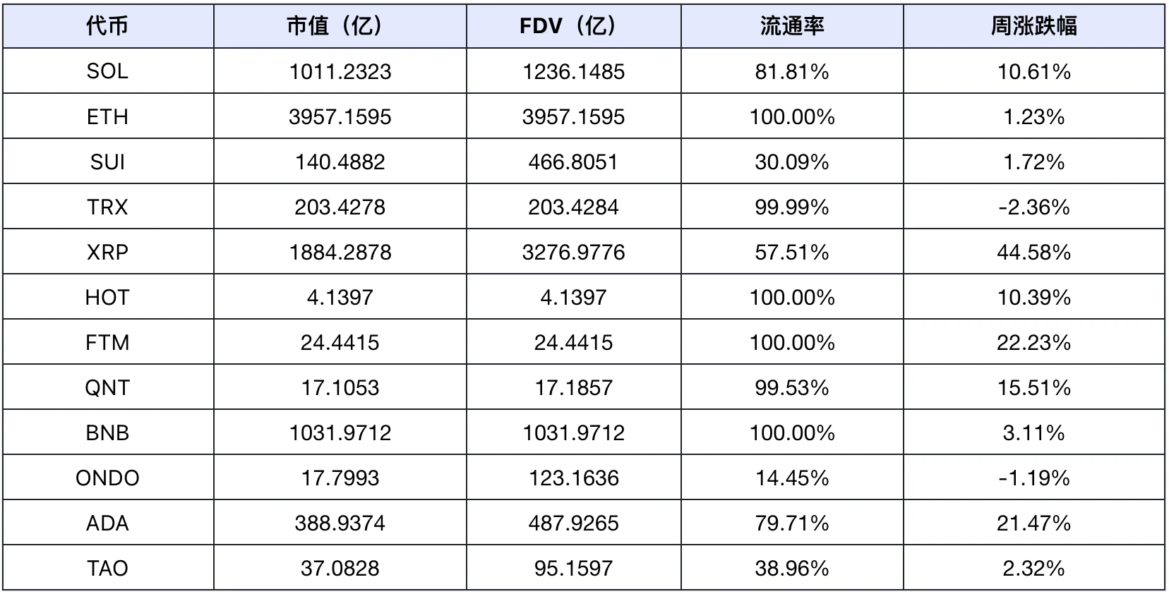 PayFi 赛道:在 PayFi 赛道中 XRP、BCH 和 XLM 占比较大,占比分别为: 83.37% 、 3.96% 和 6.92% ,总计 94.74% ,本周 XRP、BCH 和 XLM 表现非常强势,分别上涨了 44.58% 、 8.16% 和 23.86% 。其中因为特朗普表示要优先考虑将 XRP 和 SOL 作为战略储备,使得 XRP 迅速上涨,从而带动了整个 PayFi 赛道。