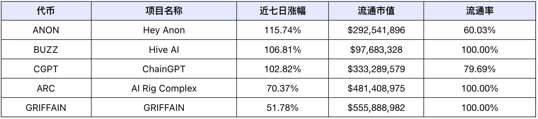 根据 LunarCrush 每日增长前五和 Scopechat 中 AI 得分前五的数据得出本周(1.11-1.17)统计数据: