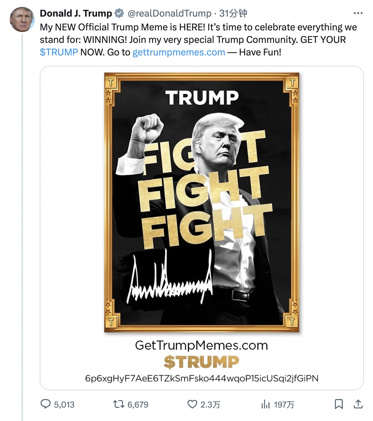 10: 00 整,特朗普先是其旗下社交媒体 Truth Social 上发文宣布,将推出个人 Meme 币 TRUMP,用户需访问域名为“gettrumpmemes”的网站以获得该 meme。