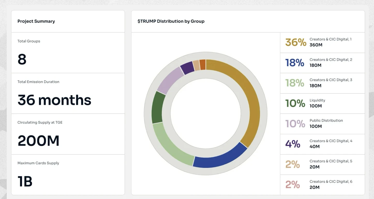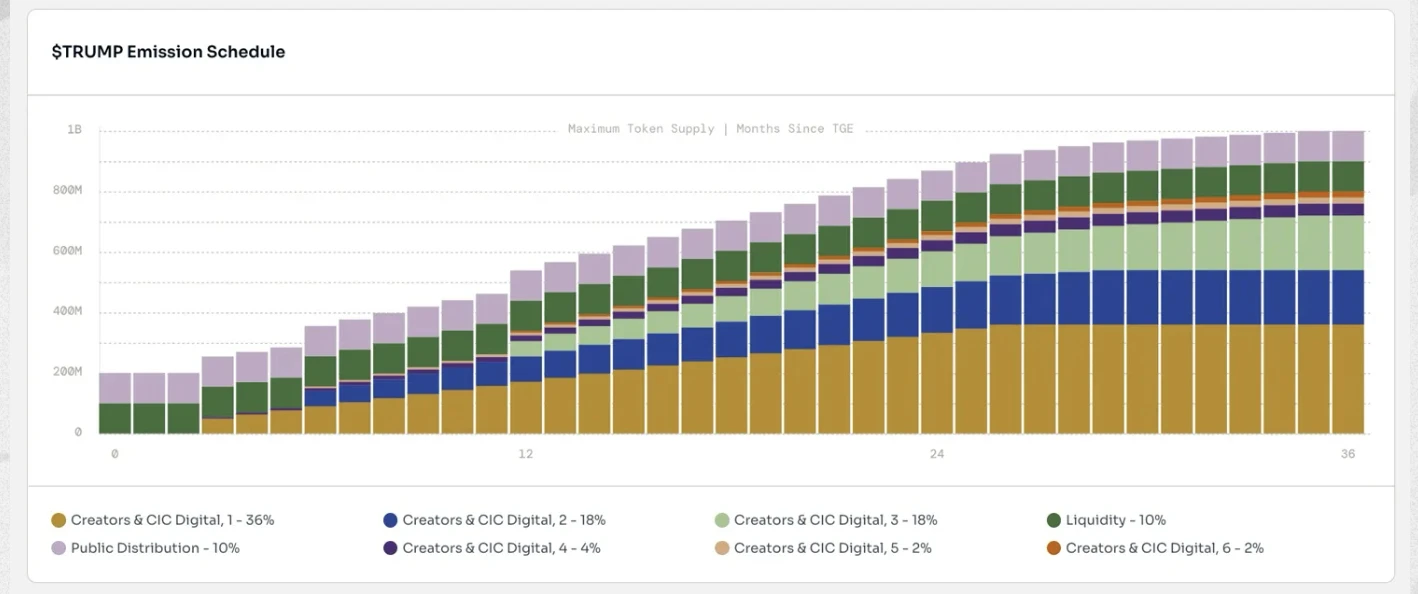 TRUMP 总供应量为 10 亿枚,但创始之初只会流通 2 亿枚,剩下 8 亿将在未来 3 年间逐渐解锁。具体代币分配情况及解锁进度如下图所示。