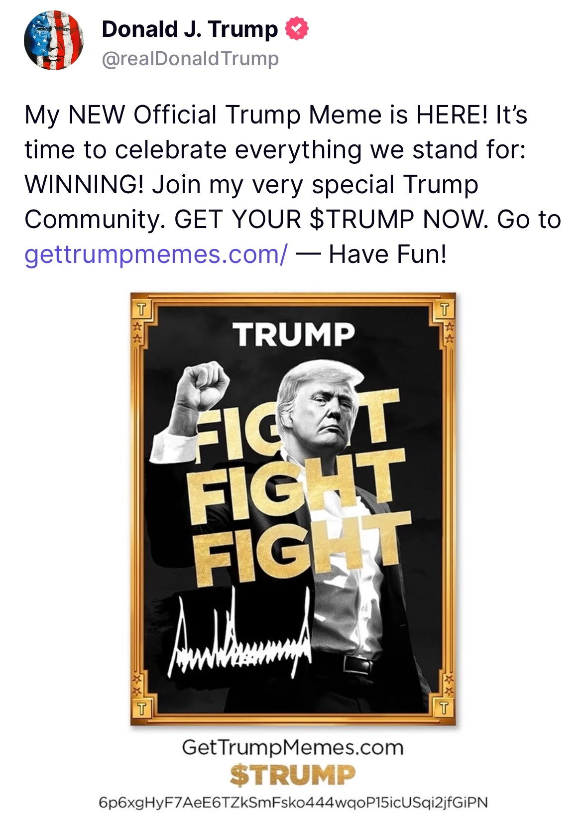 TRUMP 发行于 Solana 链上,该代币系为了纪念 2024 年 7 月 13 日特朗普遭遇刺杀后高举拳头,喊出标志性的战斗口号 “FIGHT FIGHT FIGHT”的飒爽英姿。