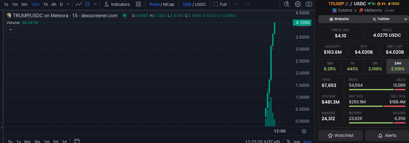 在川普发布官方迷因币 $TRUMP 后,瞬间引起市场 FOMO 情绪,该代币也在发布后一小时市值突破 40 亿美元。据 Dexscreener 数据 ,截至目前 $TRUMP 价格报 4.108 美元,市值约达 4.02 亿美元,近 24 小时涨幅达到 2108 %。