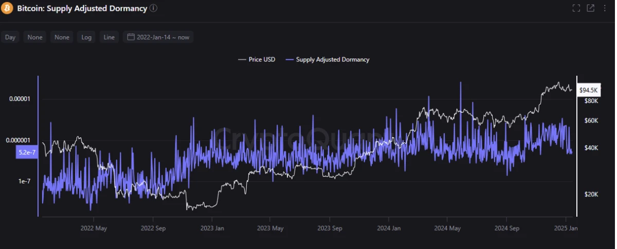 此外,调整供应过后的休眠期指标揭示了一个令人担忧的趋势:在价格上涨时,链上活动会激增,但随着价格回调,休眠期水平却急剧上升。这种周期性行为突显了长期流动性支持的缺失,并暴露了市场对短期投机兴趣的依赖。
