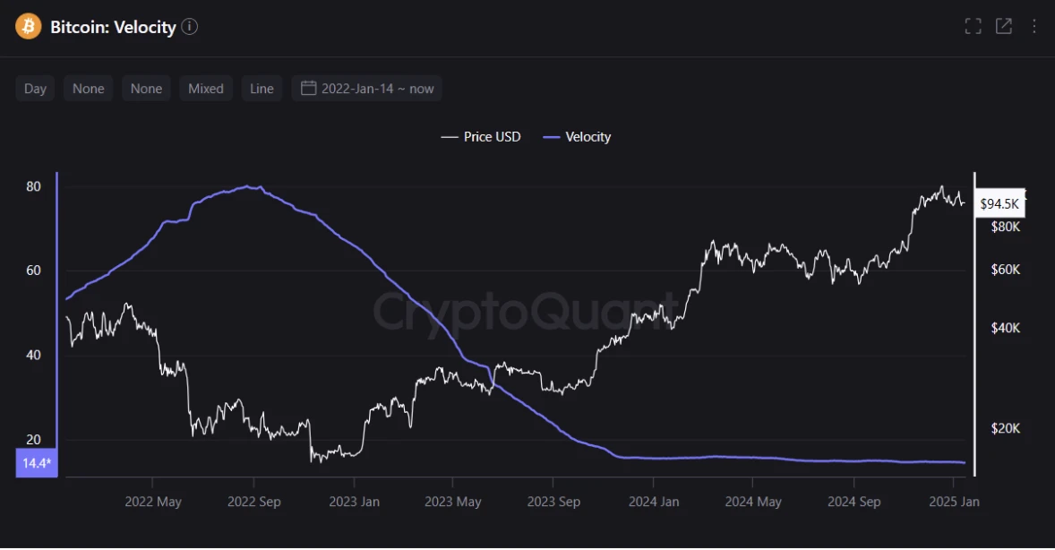 根据 CryptoQuant 的数据,比特币的流通速度已降至 14.4 ,反映出自 2022 年以来资本周转的显著放缓。这个趋势表明,市场中的交易数量正在减少,流动性越来越集中。市场不再是充满活力的链上活动场所,反而由大额持有者和投机行为主导,使得比特币生态系统愈加脆弱,容易受到外部冲击的影响。