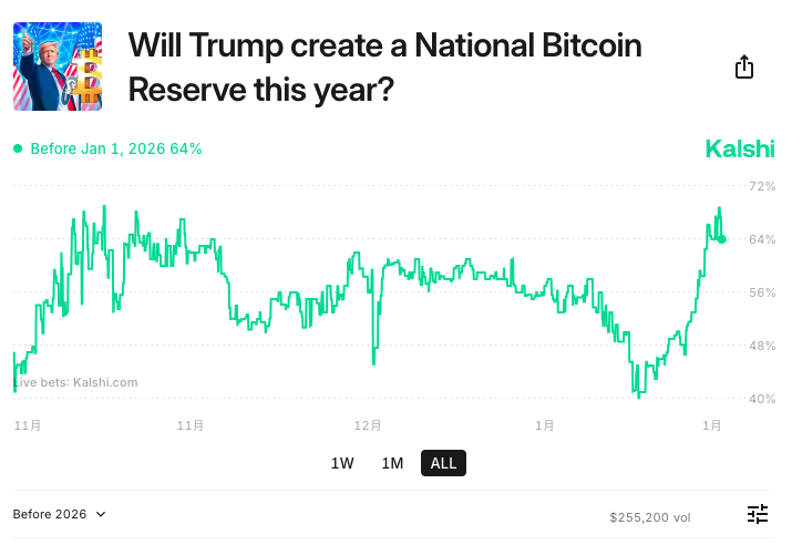 另一方面,在美国合规预测市场 Kalshi 中,「 川普会在今年建立国家比特币储备 」的赌盘机率已从 1 月 10 日的低点 41% 飙升至 18 日的 64%,显示市场对川普建立比特币𢧐略储备的信心正在逐步提高。