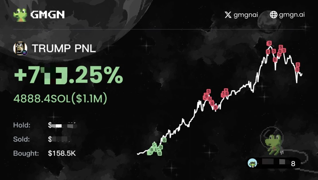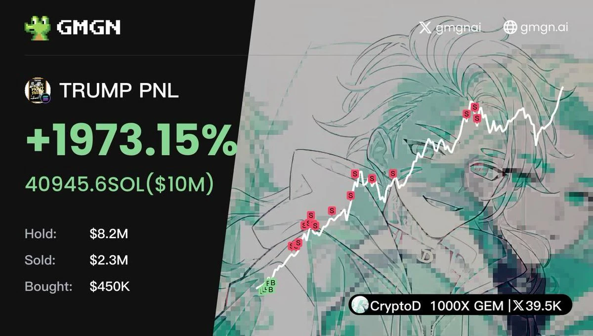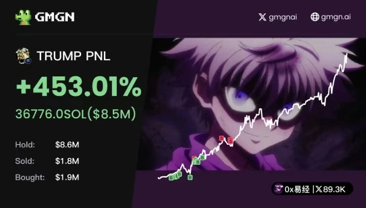 据 0x uezhang 丨 985.eth 本人于 发推表示 :“第一时间用 gmgn 买上了(TRUMP),这个号靠 20 sol 成功打到了 1000 sol。”据 GMGN 网站 信息显示,其盈利规模超 100 万美元。