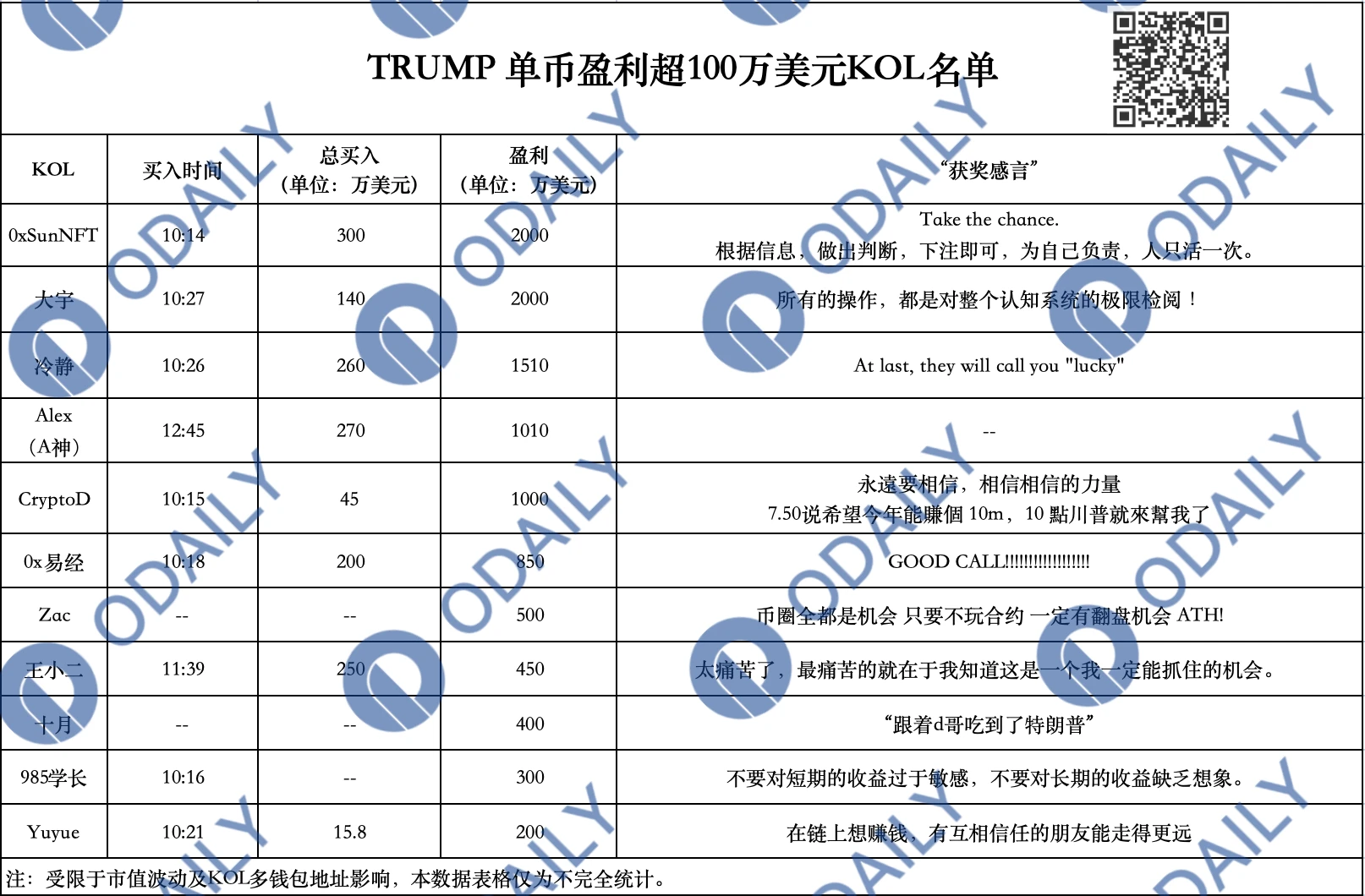 也加入了 TRUMP 的 ALL IN 大军之中,并且获得了可观的收益,据不完全统计,盈利至少超 500 万美元。