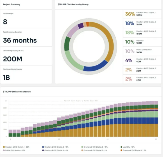 而从代币分发来看,TRUMP总供应量为10亿枚,但最初流通仅为2亿枚,剩下8亿预计将在3年内线性解锁。看似平平无奇,但从分配比例而言,真正获益者就昭然若揭。利特朗普集团的两家附属公司占据绝对份额,特朗普旗下企业CIC Digital LLC及Fight Fight Fight LLC将坐拥80%的TRUMP代币,锁定期为3-12个月,未来24个月内解锁。