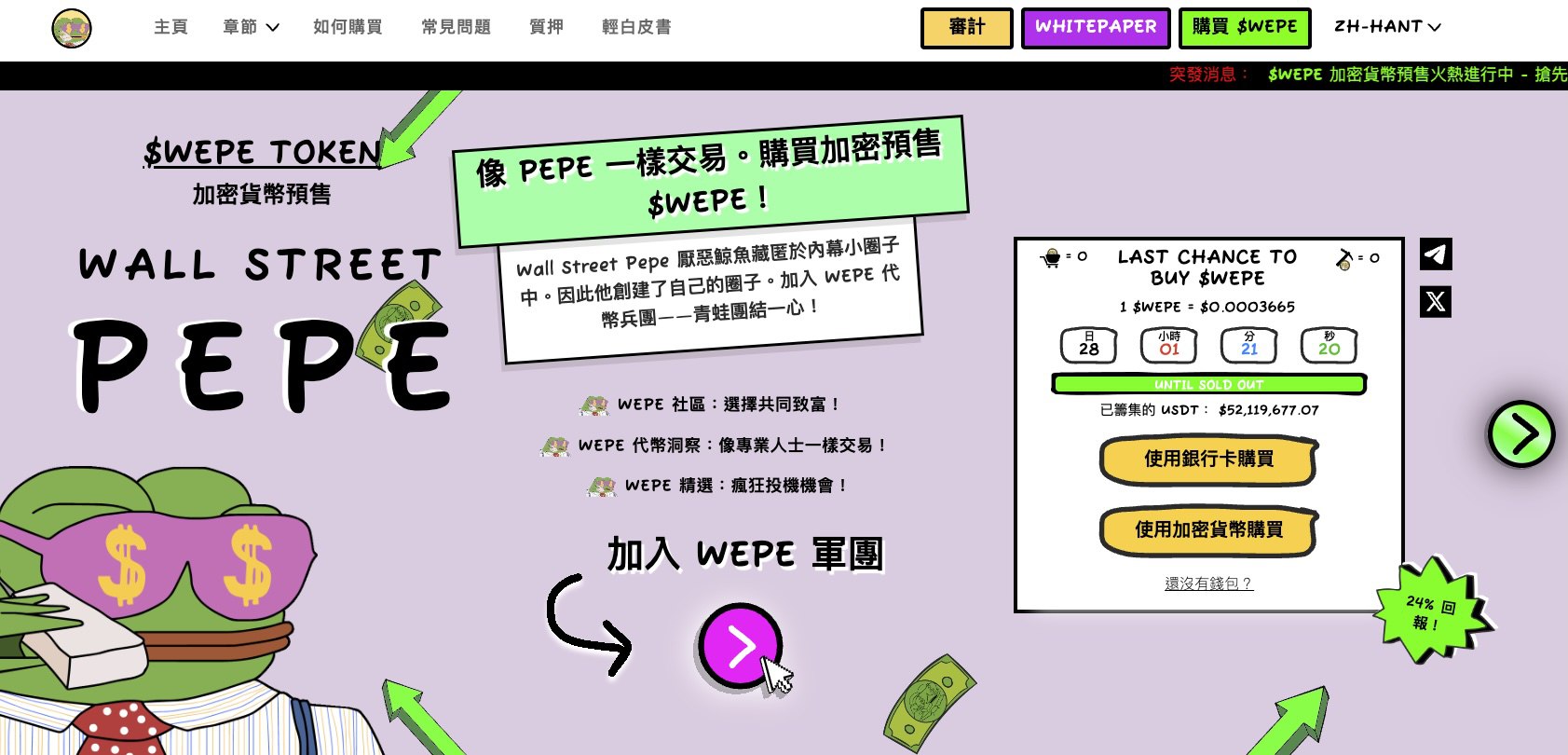 要留意,$WEPE仍在预售阶段,在预售结束后再上市DEX及CEX,建议投资者可进入官方网站、X及Telegram了解预售最新资讯。