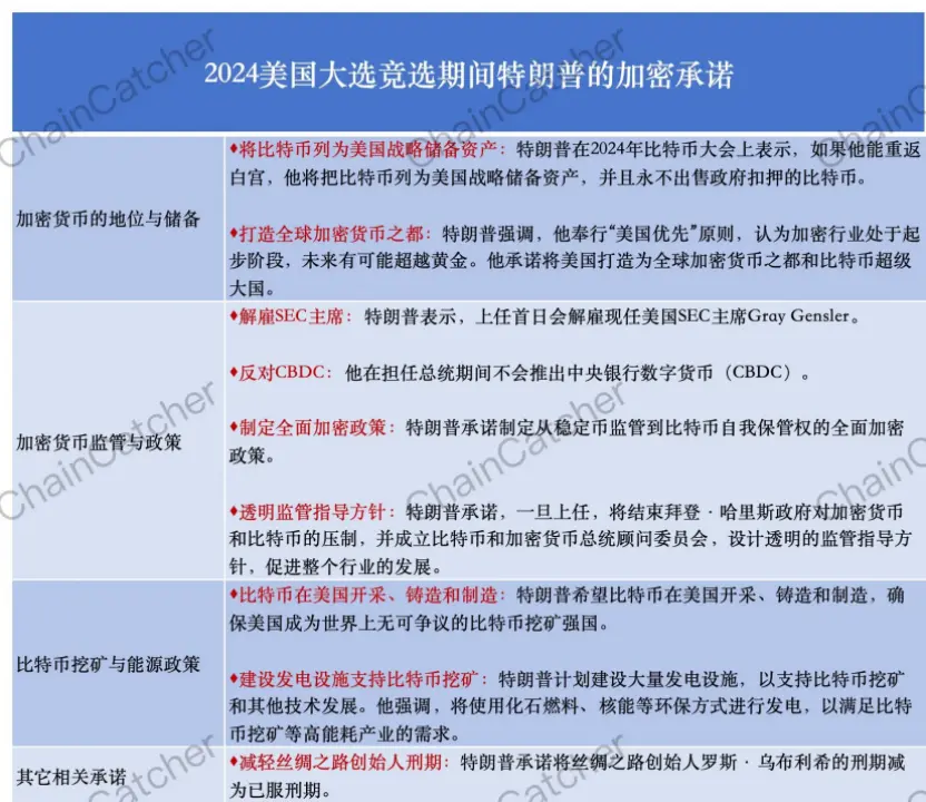 除了以上各大媒体和机构的爆料或预测外,回顾特朗普2024年竞选期间的加密承诺(如下表), 对于特朗普就职后是否立即启动国家比特币储备或是加密市场最关心的政策动向。