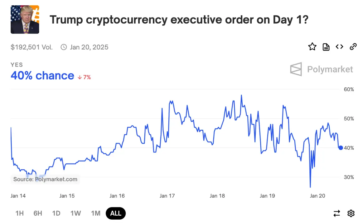 而特朗普在就职日当天就发布加密行政命令概率达到40%,该预测合约交易量超19万美元。