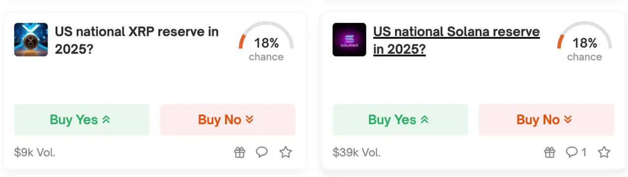 对于华盛顿邮报报道的XRP、Solana 等美国山寨币可能作为战略储备的消息,Polymarket 上也已出现了相应的预测合约,但目前通过概率都只有18%。