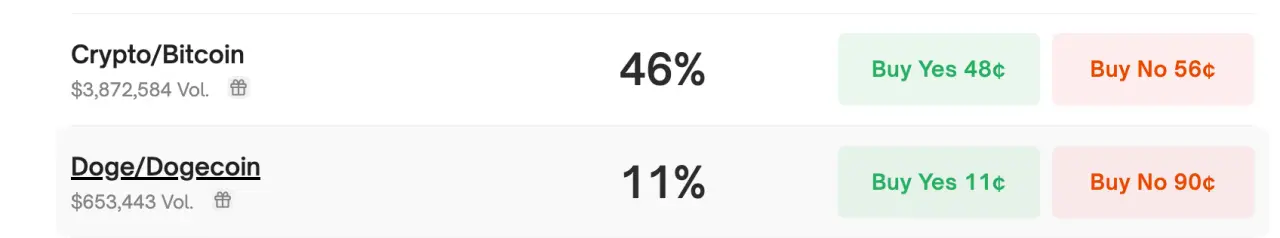 其中,用户押注超387万美元押注特朗普将在演讲中提到“加密货币”或“比特币”,此外有超过 65万美元押注他将在演讲中提到 “Doge/Dogecoin”。“加密货币”和“比特币”押注概率为 46%,“Doge/Dogecoin” 押注概率为 11%。