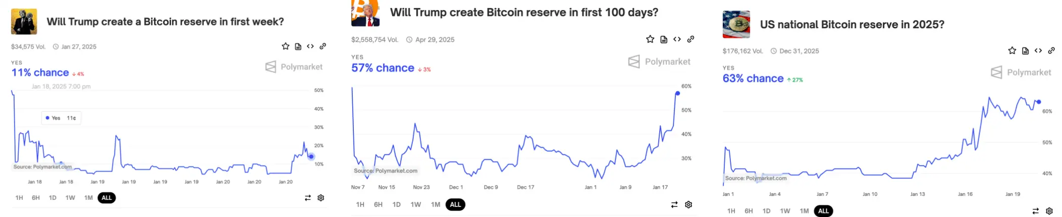 Polymarket 上预测特朗普就职一周内、100天内或2025年建立国家比特币战略的概率人分别为11%、57%、63%。