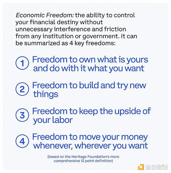 Coinbase 的核心论点加密技术的广泛采用和使用将增加经济自由。这是基于加密技术创造全球经济的承诺,由技术和人民而不是政府推动,任何有互联网连接的人都可以参与,产权得到执行,货币保值。这不是梦想。加密技术今天已经为真正的人创造了更多的经济自由: