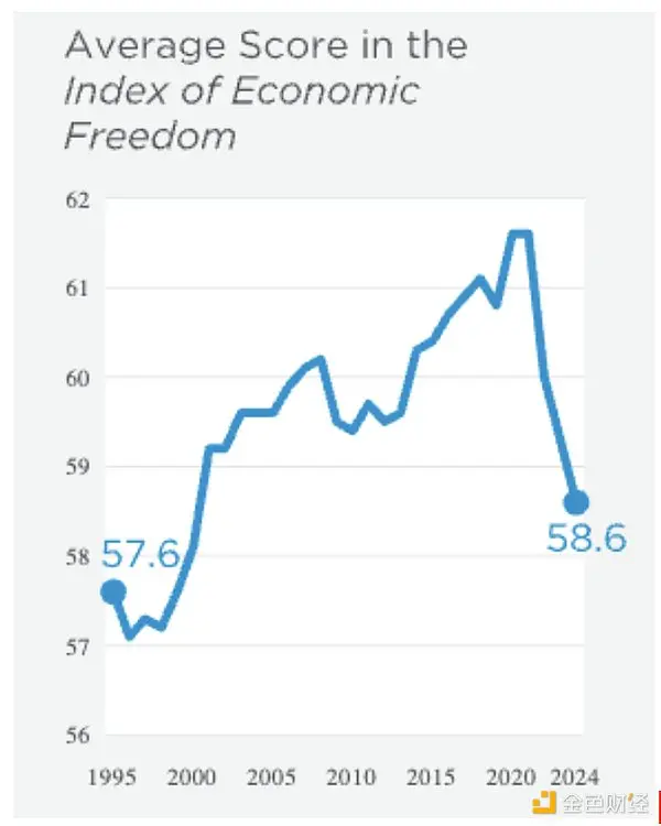 过去 100 年,我们走在正确的道路上——经济自由度不断上升,但在 21 世纪初,情况却急转直下。全球经济自由度平均得分目前是 2001 年以来的最低水平。结果:大多数经济体世界各地的人们大多被认为不自由,甚至受到压制。
