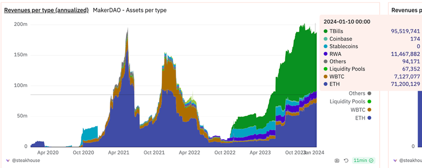 2023 年 6 月前共有 22,368 枚 MKR 被销毁,但 2023 年 7 月新燃烧引擎推出后,仅 18 个月就销毁了数量差不多的 22,335 枚。然而,燃烧速度的加快,并不是因为机制,而是 2023 年末兴起的 RWA 叙事。Maker 于 2023 年初正式开始实施 RWA,引入美债,在彼时 RWA 部分的收入已经占 Maker 总收入的一半以上。