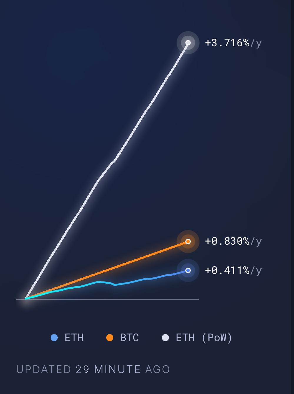如下图所示,目前以太坊每年新增约 0.411%,但与 PoW 版本的以太坊 3.716% 和比特币 0.83% 相比,已经保持了低位。