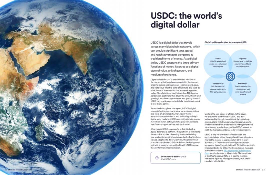 Circle 管理 USDC 的基本原则: 1)安全性:USDC 是代币化的美元,而非代币化的银行存款;2)透明度:全面披露储备资产,并由第三方提供保证;3)流动性:可全天候在全球范围内按 1: 1 比例兑换为美元;4)稳健性:全面的风险管理和世界级金融合作伙伴。