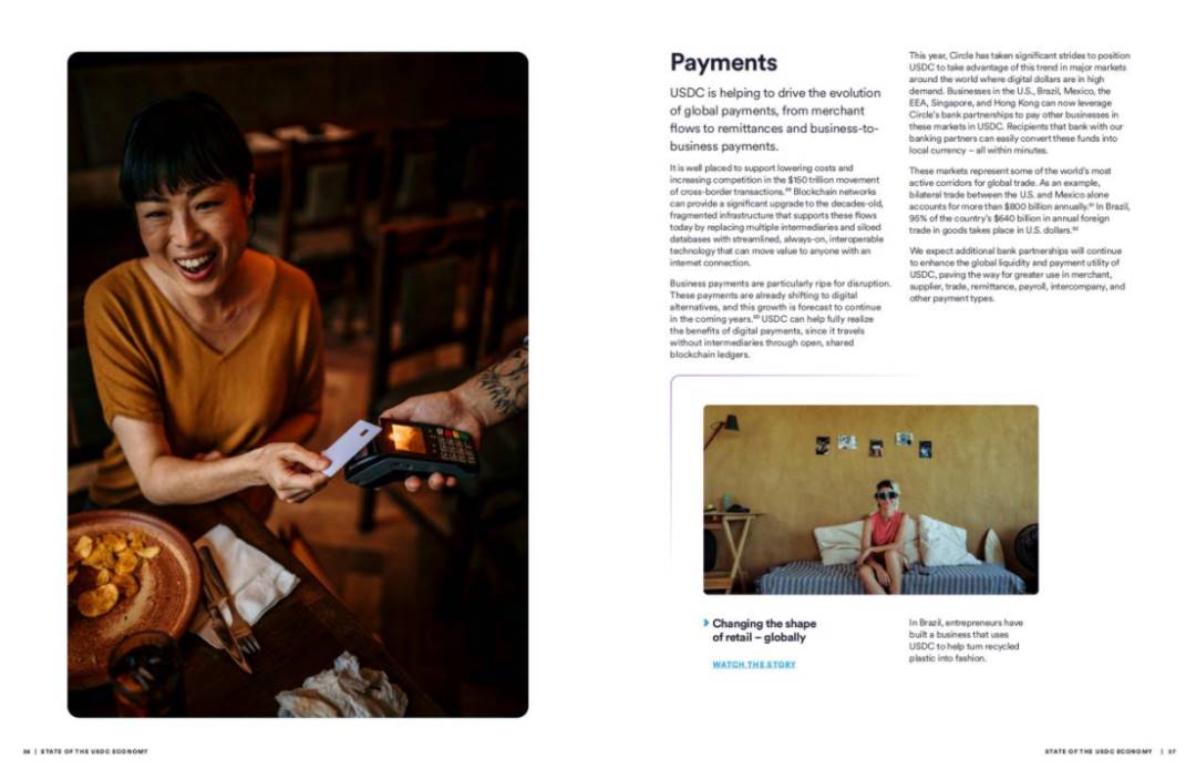 USDC 正在推动全球支付的发展,从商户收单到汇款和 B2B 支付。USDC 非常适合降低成本和增加 150 万亿美元跨境交易流动的竞争。尤其以商业支付为例,这些支付已经转向数字替代品,预计未来几年这种增长将继续下去。USDC 可以帮助充分实现数字支付的好处,因为它通过开放、共享的区块链账本进行,无需中介机构。