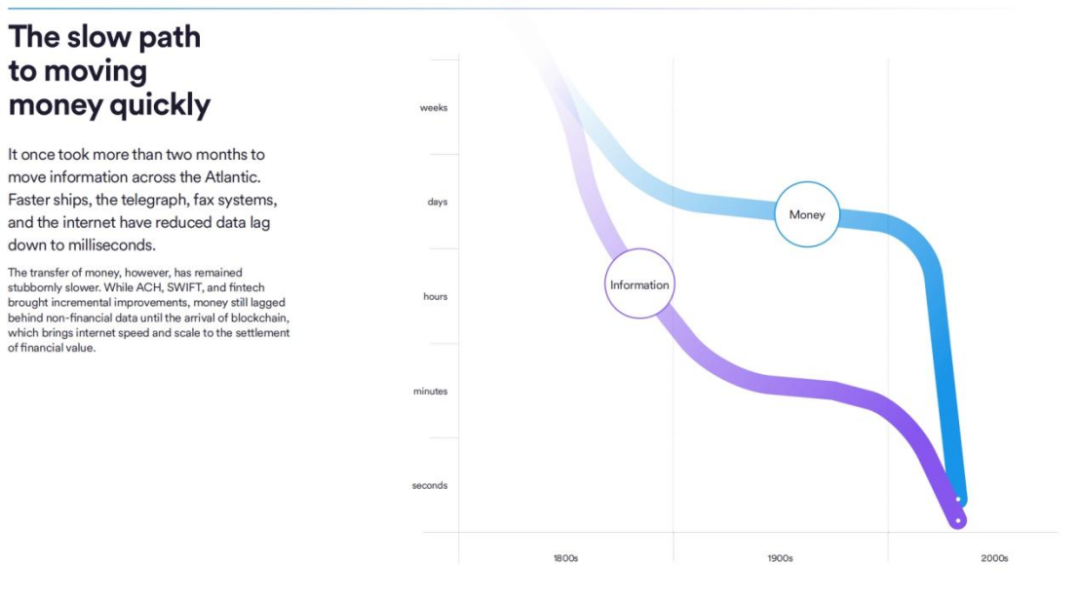 USDC 将推动资金转移进入下一个范式。过去,信息跨越大西洋需要花费两个多月的时间,更快的船只、电报、传真系统和互联网将数据延迟缩短到了毫秒级。然而,资金的转移却一直较为缓慢。尽管 ACH、SWIFT 和金融科技带来了一些改进,但在区块链出现之前,资金的转移仍然落后于非金融数据。区块链为价值的转移带来了互联网的速度和规模。