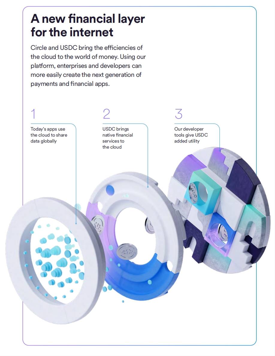 第一层叙事:互联网的金融升级。Circle 正在构建以稳定币为基础的价值互联网络,为全球金融提供网络升级,区块链为价值的转移带来了互联网的速度和规模。注意这里的故事是「互联网 +」的延续,而非「区块链 +」的拓展,毕竟当今所有应用层都是构建在互联网上。