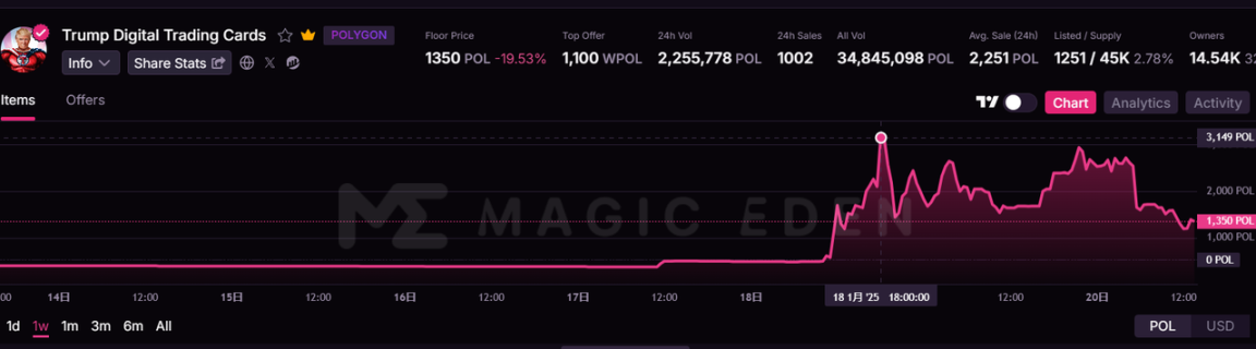 比起 MEME,特朗普对 NFT 的兴趣似乎更为浓厚。此前特朗普在 2022 年 12 月首次推出 NFT,名为「特朗普数字交易卡」,随后又于 2024 年 8 月推出「美国优先」系列 NFT 和在 2025 年 1 月推出基于比特币 Ordinals 协议的「特朗普比特币数字交易卡」NFT 系列。这些卡片以特朗普的形象为主题,展示了他作为超级英雄、牛仔等不同角色的形象,在一些系列中,购买者有机会获得额外奖励,例如与特朗普共进晚餐或获得实物纪念品(如西装碎片)等,而在市场上,狂热的情绪也将 NFT 的交易热情点燃,以 Polygon 上的 NFT 系列为例,在本周内其地板价飙升至 3149 POL(约 1417 美元)的高位。在加密市场上,特朗普似乎正在最大化 MEME 自身的价值,并通过多样化的代币形式进行变现,当然,其权势的旺盛也为相关资产注入了强心针。