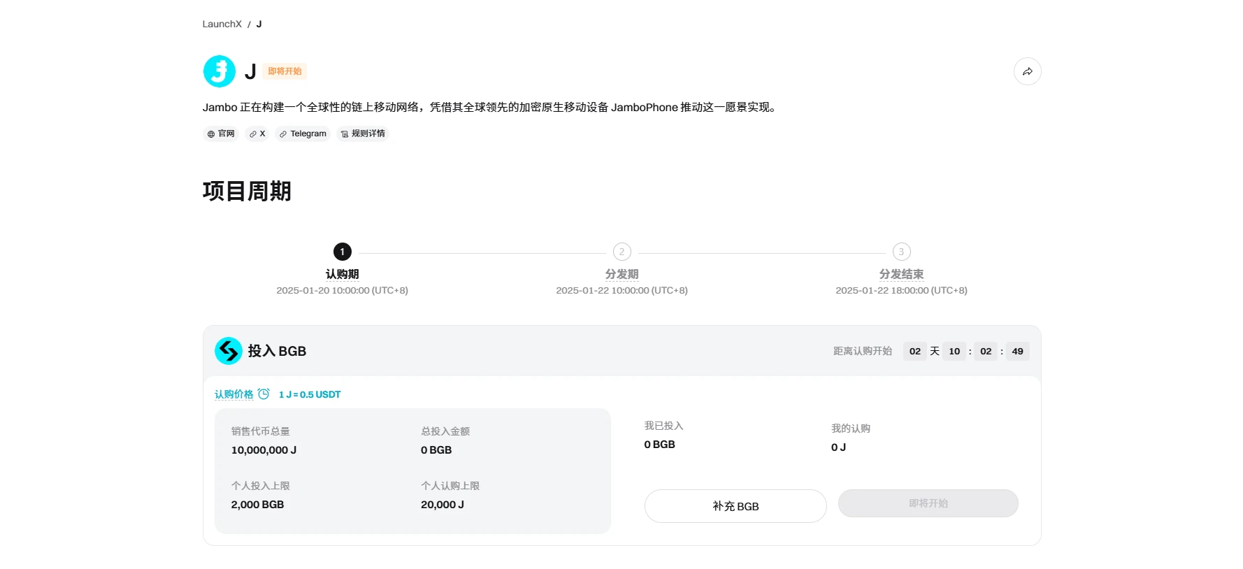 Jambo Token(J)在 Bitget LaunchX 上的认购于 2025 年 1 月 20 日 10 点正式开启,认购价格为 0.5 美元。个人参与 Jambo Token 认购的上限为 2000 BGB,需使用 BGB 进行认购。