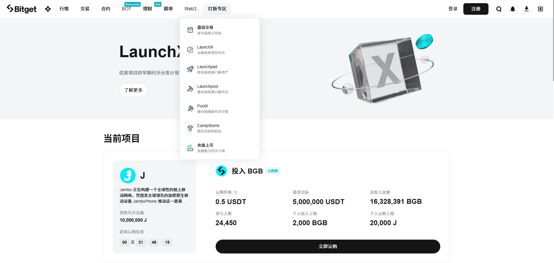 J 代币认购已于 1 月 20 日 10 点正式开始,登录 Bitget 账户后前往 LaunchX 专区,可见 Jambo 项目的项目介绍、认购价格、剩余可认购数量等信息。点击 Jambo 项目认购入口进入认购页面。