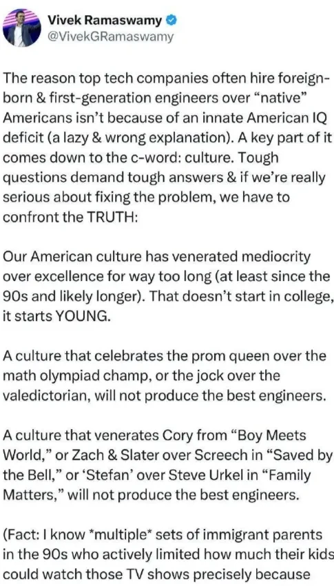 “顶尖科技公司经常雇佣外国出生和第一代移民工程师而非 “本土” 美国人,原因不是因为美国本土人天生智商有缺陷(这是一种懒惰且错误的解释)。其中一个关键因素归结于那个以 “c” 开头的词:文化。棘手的问题需要强硬的答案,如果我们真的认真对待解决这个问题,我们就必须直面真相:我们的美国文化长期以来(至少从 90 年代开始,可能更早)推崇平庸而非卓越。这种情况不是从大学开始的,而是从小就开始了。一种推崇舞会皇后胜过数学奥林匹克冠军,或者推崇体育健将胜过致告别辞的优秀毕业生的文化,是培养不出最优秀的工程师的。一种推崇《男孩成长记》里的科里 Cory、《救命下课铃》里的 Zach 和斯莱特 Slater 而非 Screech、《住家外星人》里的 Stefan 而非 Steve Urkel 的文化,是培养不出最优秀的工程师的。