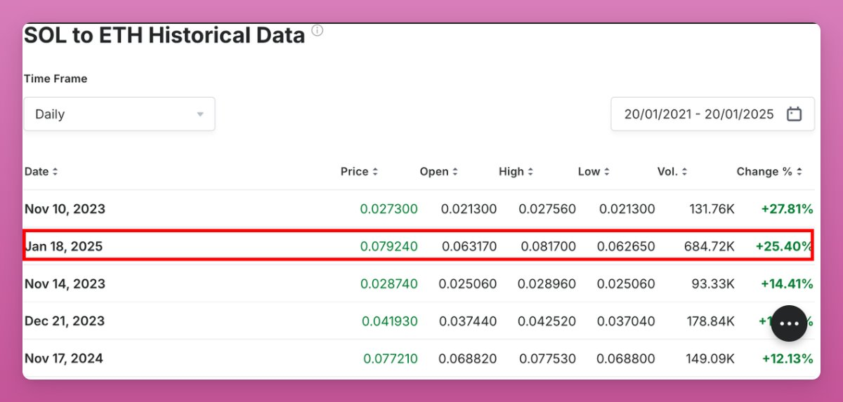 TRUMP 币推出当天,SOL 兑 ETH 创下了 2021 年以来的最大单日涨幅,25% 的涨幅进一步打击了以太坊社区的士气,加大了以太坊基金会内部改革的压力。