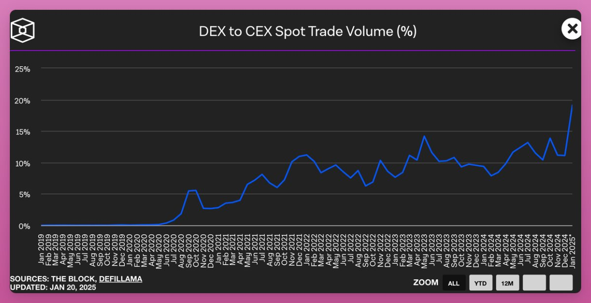 因此,DEX 相对 CEX 现货交易量占比达到 19% 的历史最高水平。